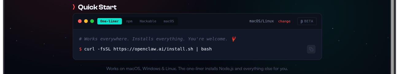 curl -fsSL https://openclaw.ai/install.sh | bash