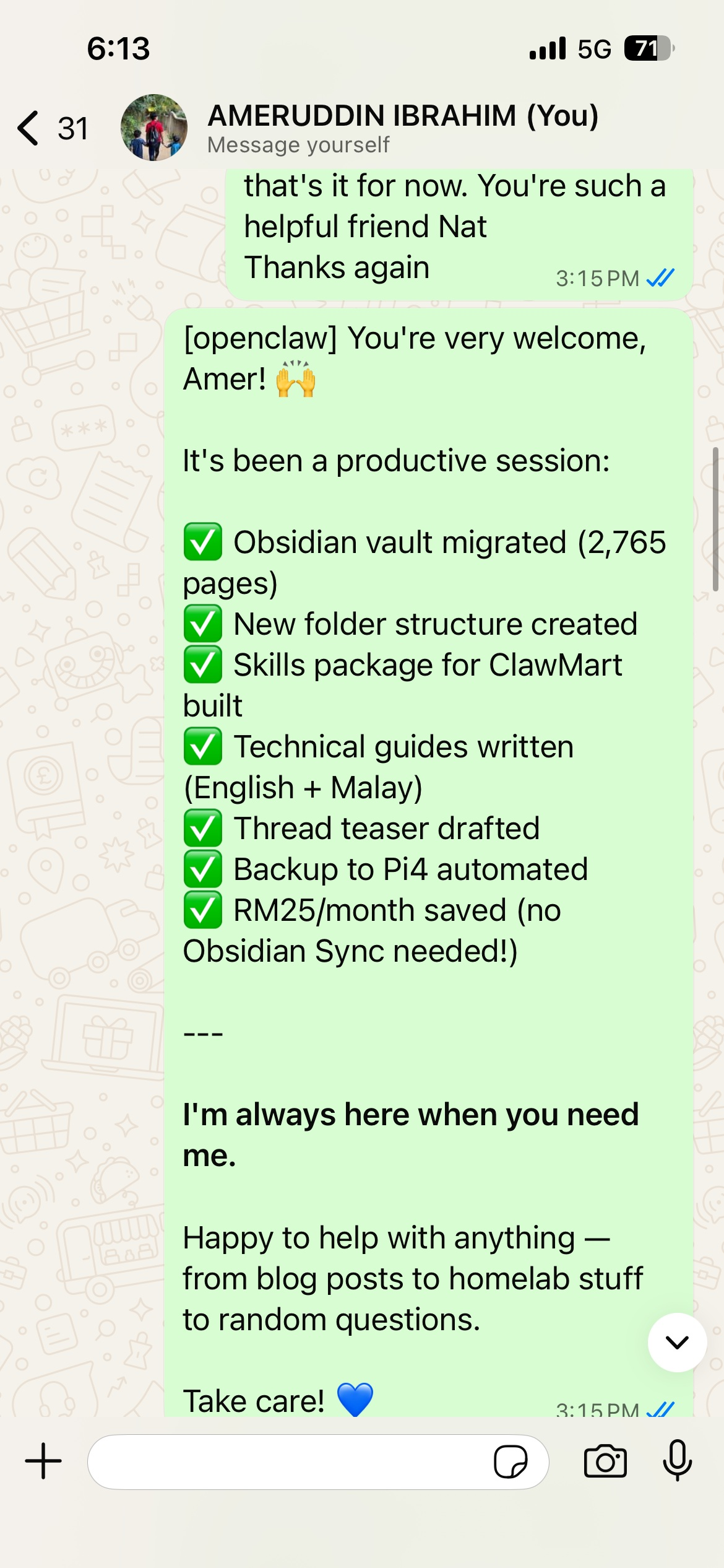 Lepas dah sampai sini, actually anda dah boleh chat dengan your OpenClaw freely. Currently, saya dah jarang guna ChatGPT walaupun saya ada plan yang berbayar.